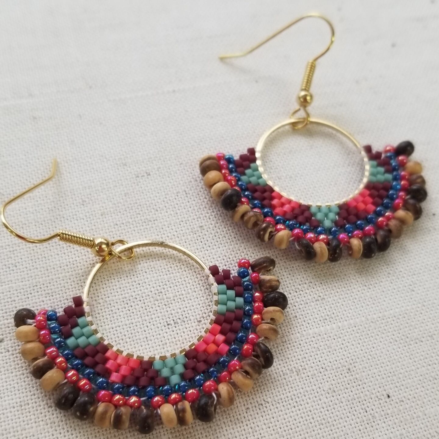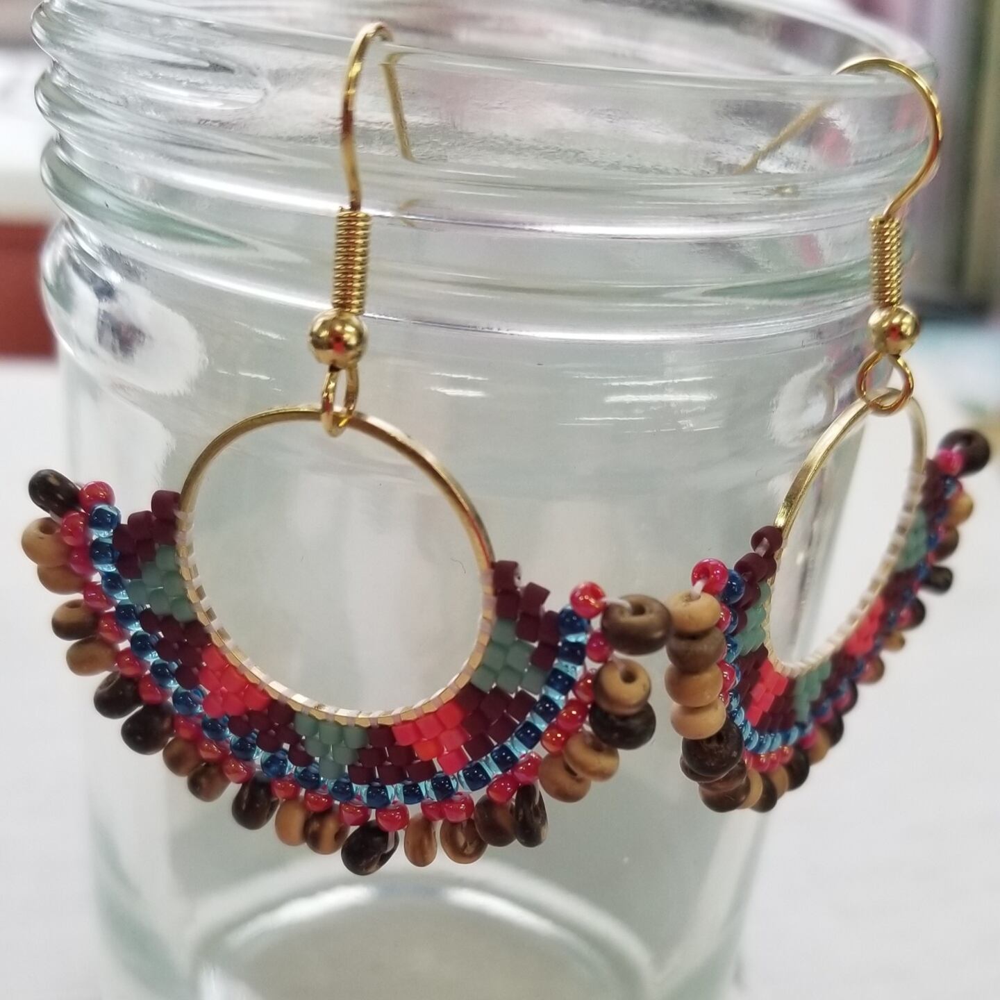 幾何学模様とウッドビーズがアフリカっぽさを演出してくれるピアスです。耳元で揺れるのがポイントです。