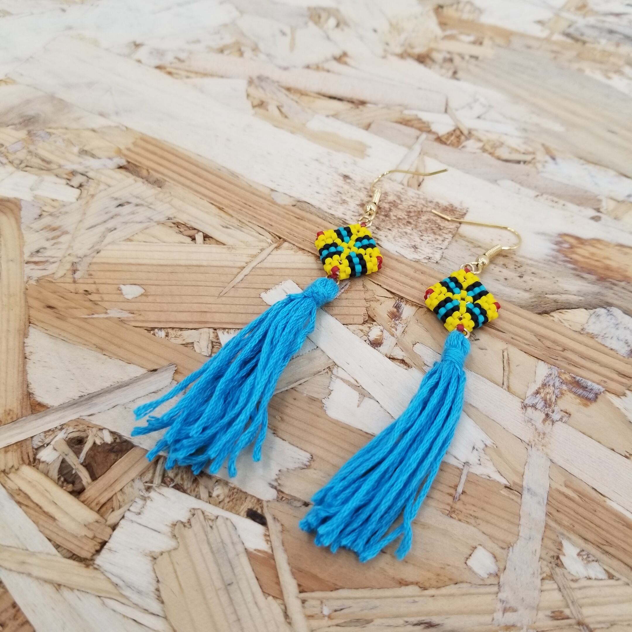 モザイクタイルみたいなモチーフに刺繍糸のタッセル付けました。